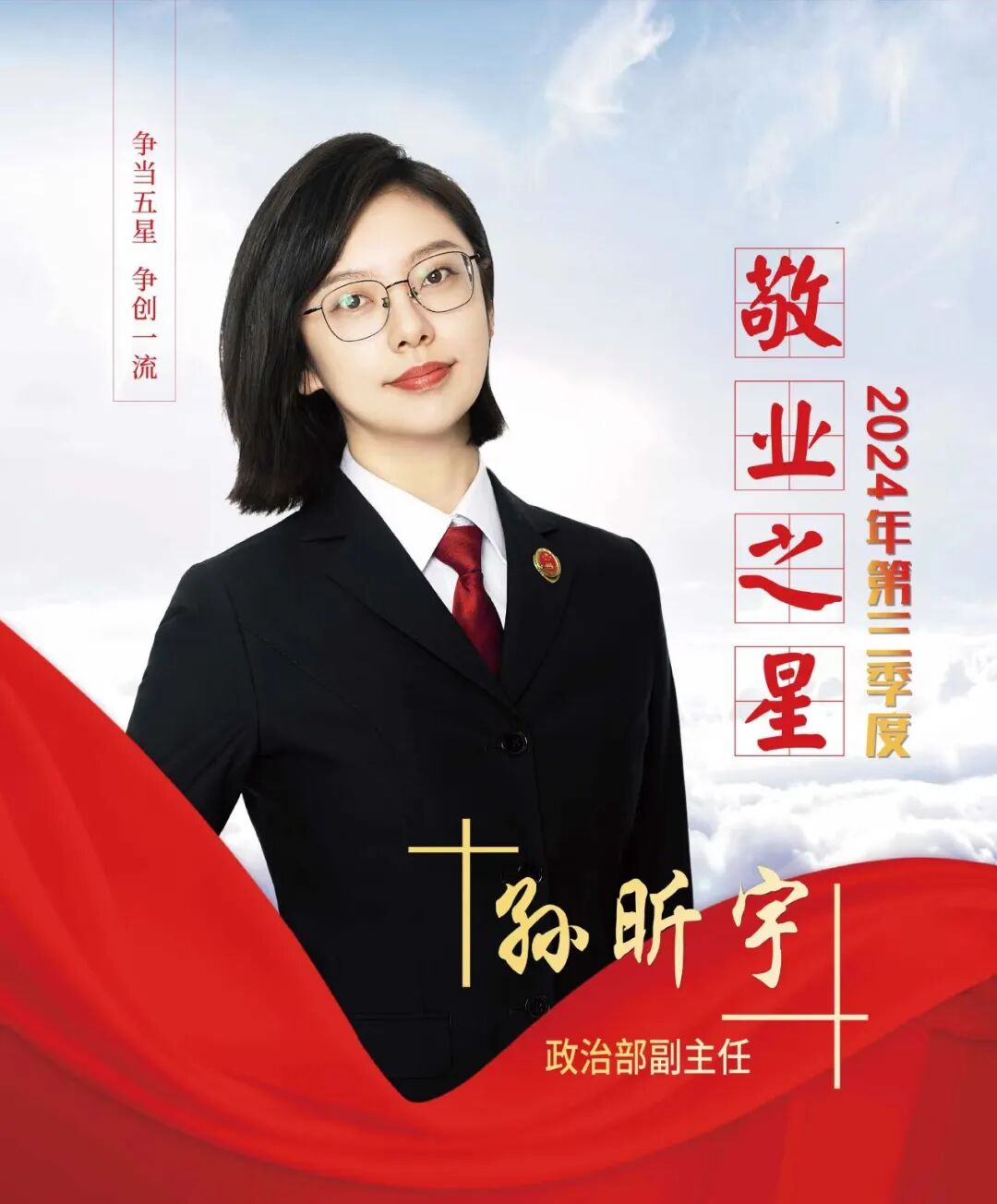 “敬业之星” ——政治部副主任孙昕宇:该同志从事检察工作以来,先后在多个部门锻炼,无论从事业务工作还是综合行政工作,她都能够坚守初心、勇担使命,坚持原则、公平公正。多年来,该同志一直秉持敬业精神,对工作坚持高标准、严要求,模范遵守单位各项规章制度,以饱满的热情、扎实的工作作风,不断提升自身素质和工作能力,获评2023年度全旗政法系统“政法忠诚卫士”、多次获评“先进工作者”等荣誉。