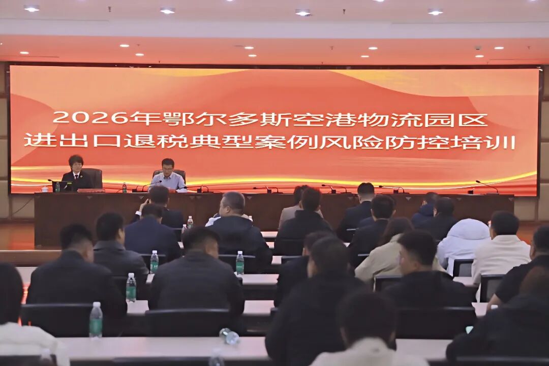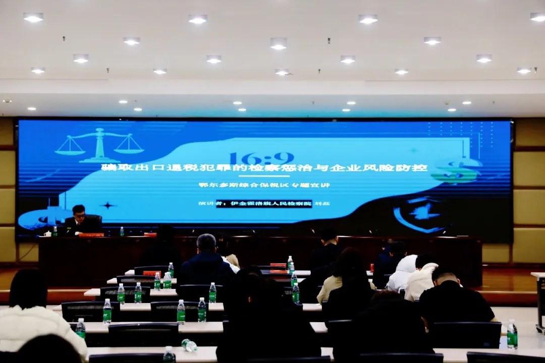 为深入贯彻落实服务保障口岸经济、外向型经济高质量发展工作要求,充分发挥检察职能助力鄂尔多斯空港物流园区法治化营商环境建设,近日,鄂尔多斯市人民检察院、伊金霍洛旗人民检察院联合鄂尔多斯空港物流园区管委会,共同举办进出口退税典型案例风险防控专题培训。鄂尔多斯海关、园区各内设机构、垂管单位相关负责人及鄂尔多斯市综合保税区全体职工参加培训。