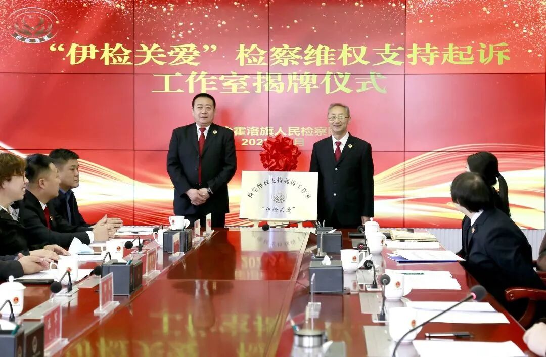 3月23日上午,内蒙古自治区首家检察维权支持起诉工作室在伊金霍洛旗人民检察院举行。鄂尔多斯市人民检察院有关领导及旗法院、公安、司法、民政、人社、妇联、残联、工会等十二家成员单位负责人共同为“伊检关爱”检察维权支持起诉工作室揭牌。